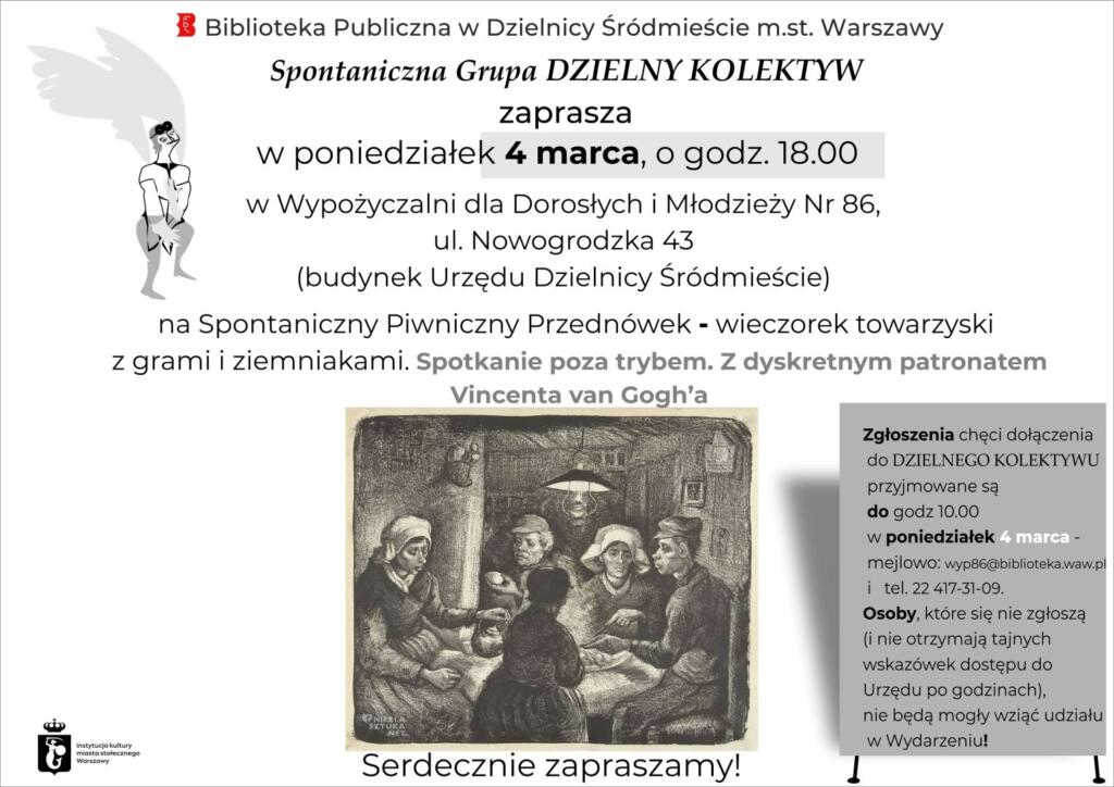 ul. Nowogrodzka 43 (budynek Urzędu Dzielnicy Śródmieście) na Spontaniczny Piwniczny Przednówek – wieczorek towarzyski z grami i ziemniakami. Spotkanie poza trybem. Z dyskretnym patronatem Vincenta van Gogh’a.