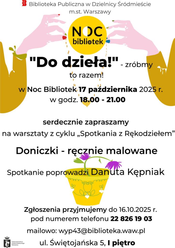W Noc Bibliotek zapraszamy do Wypożyczalni Nr 43 przy ul. Świętojańskiej 5 na warsztaty artystyczne z cyklu „Spotkania z Rękodziełem”. Wykonamy doniczki – ręcznie malowane.
