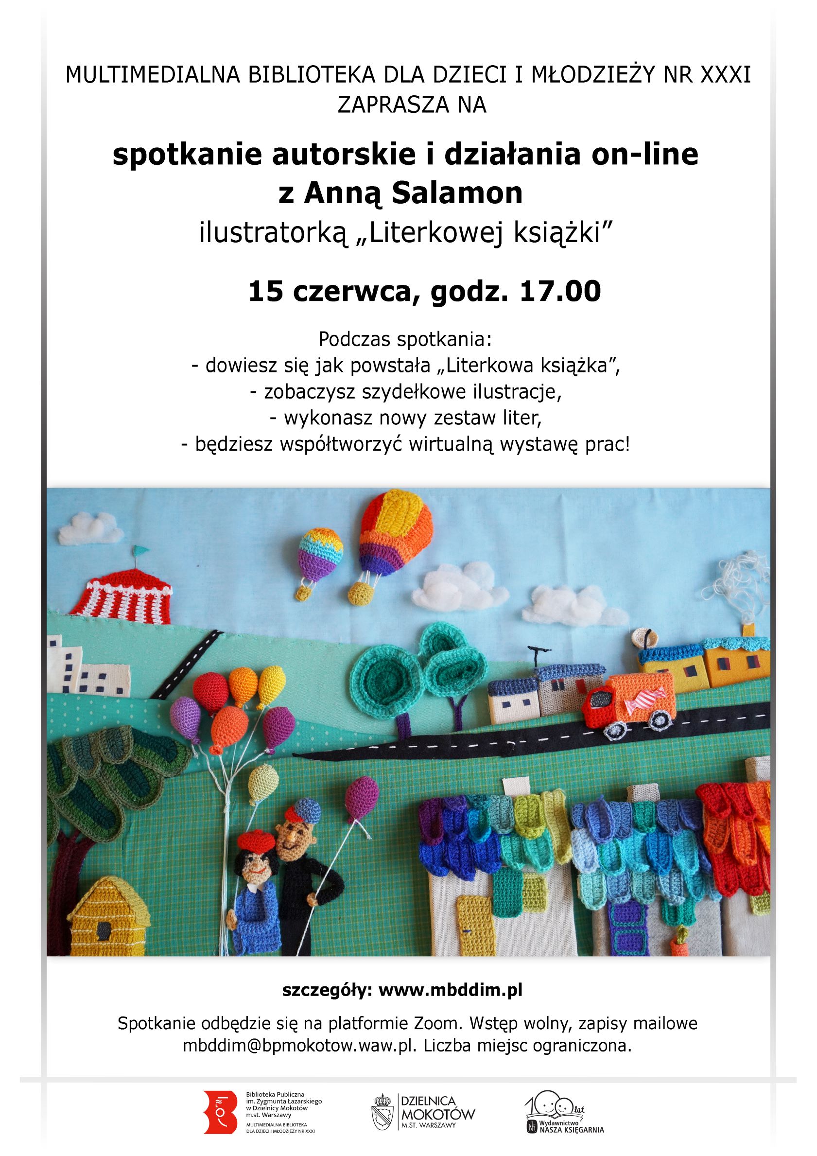 Zapraszamy do witryny Multimedialnej Biblioteki dla Dzieci i Młodzieży nr XXXI, gdzie można oglądać do 15 czerwca prace Anny Salamon do „Literkowej książki”. Tego samego dnia można również uczestniczyć w spotkaniu i działaniach on-line z ilustratorką, w ramach finisażu wystawy.