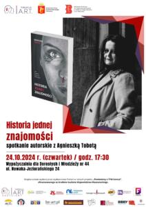 Wypożyczalnia dla Dorosłych i Młodzieży nr 44, mieszcząca się przy ul. Nowaka-Jeziorańskiego 24 zaprasza 24 października 2024 r. o godz. 17:30 na spotkanie z Agnieszką Tobotą, autorką książki „Historia jednej znajomości”. Wstęp wolny.