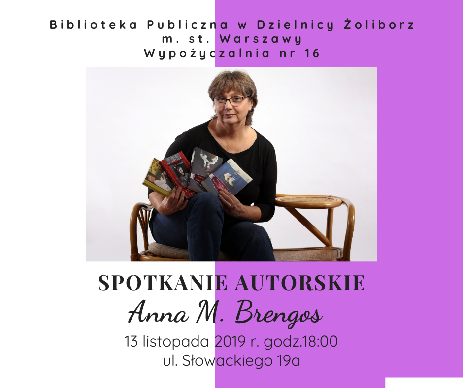 Biblioteka Publiczna w Dzielnicy Żoliborz m.st. Warszawy zaprasza na spotkanie autorskie z Panią Anną Brengos, autorką popularnych powieści „Scenariusz z życia” (2014 r.) , czy „Prażeńka”(2018 r.). Autorka opowie o swojej pracy twórczej, inspiracjach, o okolicznościach powstania pierwszej powieści oraz kolejnych.