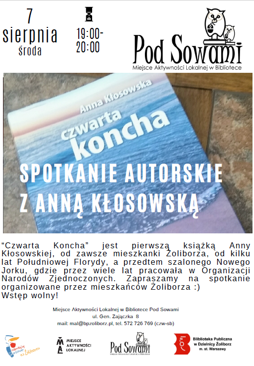 Biblioteka Publiczna w Dzielnicy Żoliborz m.st. Warszawy zaprasza na spotkanie autorskie z Anną Kłosowską, autorką książki „Czwarta Koncha” do Czytelni Pod Sowami przy ul. gen. Zajączka 8.