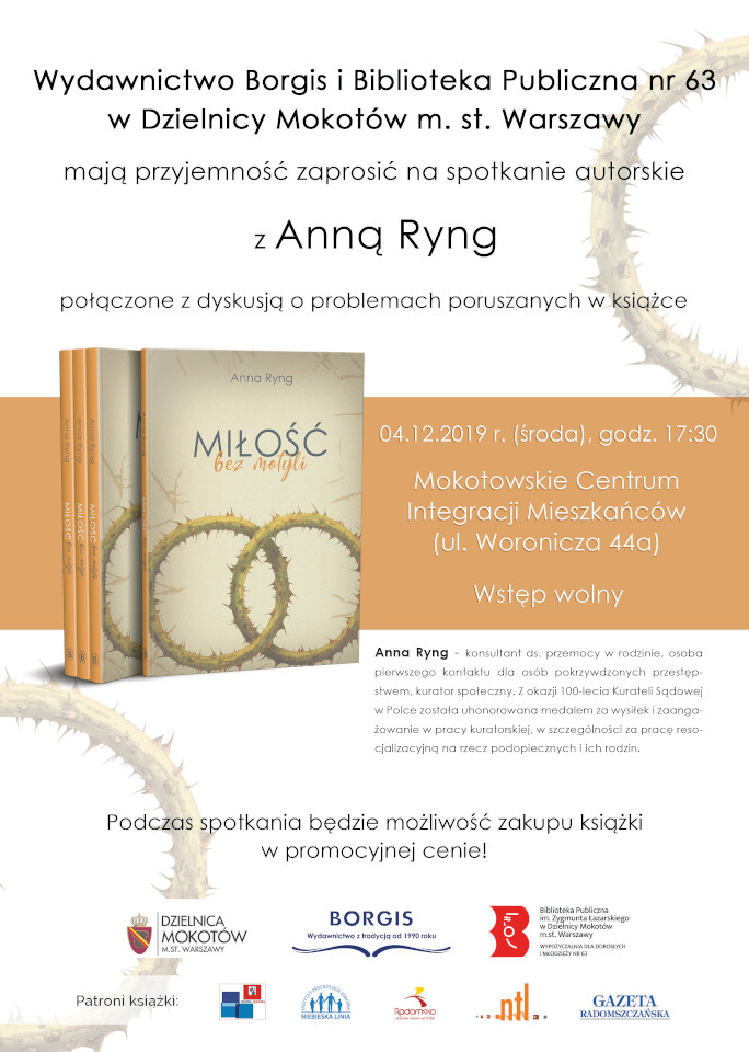 Wypożyczalnia nr 63 oraz Wydawnictwo Borgis  zapraszają na spotkanie z Anną Ryng autorką książki „Miłość bez motyli”, które odbędzie się w dniu 4 grudnia o  17:30 w Mokotowskim Centrum Integracji Mieszkańców przy ul. Woronicza 44 A.
