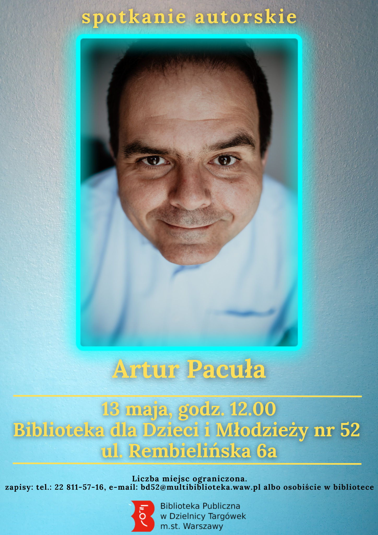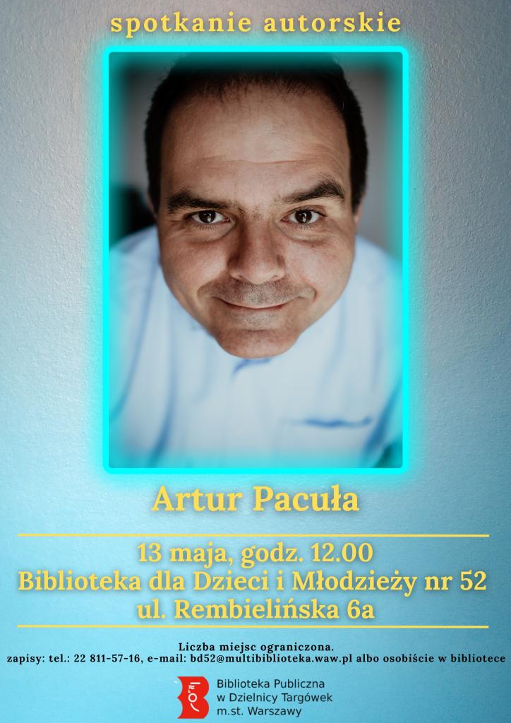 Biblioteka Publiczna w Dzielnicy Targówek m.st. Warszawy serdecznie zaprasza na spotkanie z Arturem Pacułą – pisarzem, autorem książek, m.in. „Gdzie jest korona cara” – powieści, która zajęła drugie miejsce w konkursie na Najlepszą Samochodzikową Książkę 2015 roku. Kolejne książki – „Gdzie jest skrzynia z karabinami” (2017) oraz „Gdzie jest skrytka generała Grota” (2018) – zajęły w tym konkursie pierwsze miejsca.