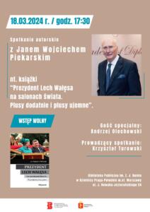 W poniedziałek, 18 marca 2024 r. o godz. 17:30 w siedzibie Biblioteki Publicznej w Dzielnicy Praga-Południe przy ul. J. Nowaka-Jeziorańskiego 24, odbędzie się spotkanie autorskie z Janem Wojciechem Piekarskim, dyplomatą, wykładowcą, byłym ambasadorem Polski m.in. w Belgii i Luksemburgu. Nasz gość opowie o książce swojego autorstwa, pt. „Prezydent Lech Wałęsa na salonach świata. Plusy dodatnie i plusy ujemne”.