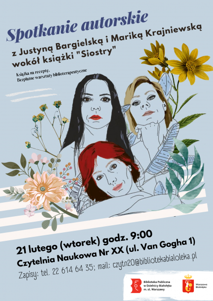 21 lutego (wtorek) o godz. 9.00 w Czytelni Naukowej Nr XX (ul. Van Gogha 1) odbędzie się spotkanie autorskie z Justyną Bargielską i Mariką Krajniewską wokół książki „Siostry”. Spotkanie to jest częścią cyklu „Książka na receptę. Warsztaty biblioterapeutyczne”.
