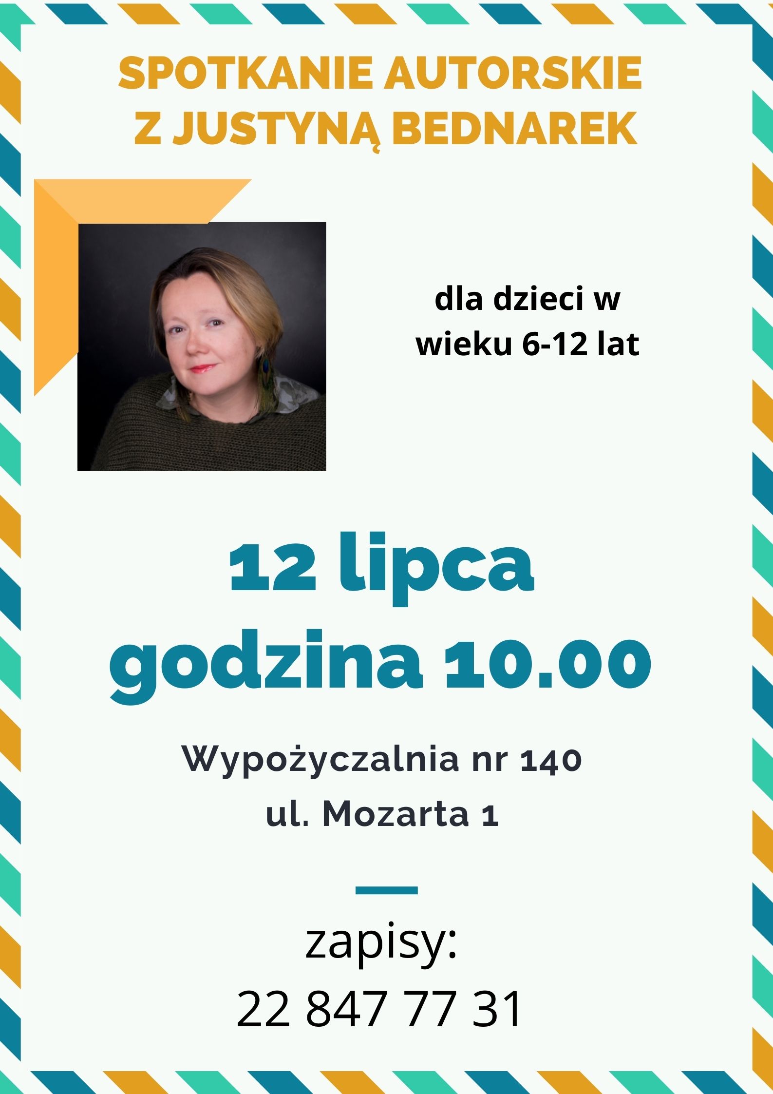 Wypożyczalnia dla Dorosłych, Młodzieży i Dzieci nr 140 w Dzielnicy Mokotów serdecznie zaprasza dzieci w przedziale wiekowym 6-12 na spotkanie autorskie z Justyną Bednarek .