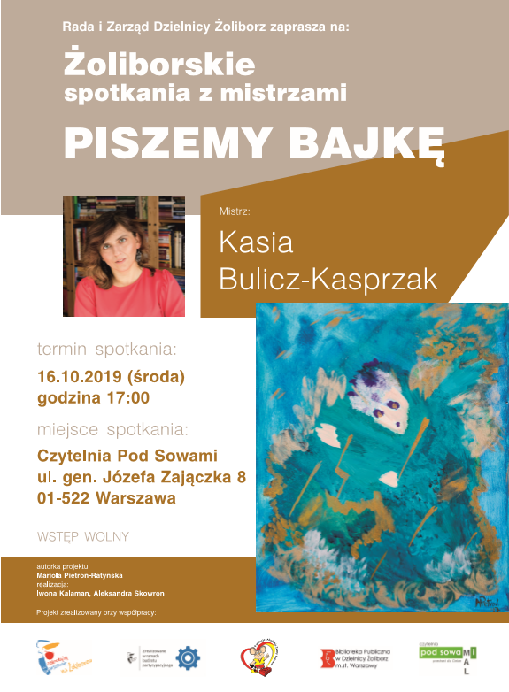 Biblioteka Publiczna w Dzielnicy Żoliborz m.st. Warszawy zaprasza na spotkanie autorskie z Panią Katarzyną Bulicz-Kasprzak pod tytułem „Piszemy Bajkę”.