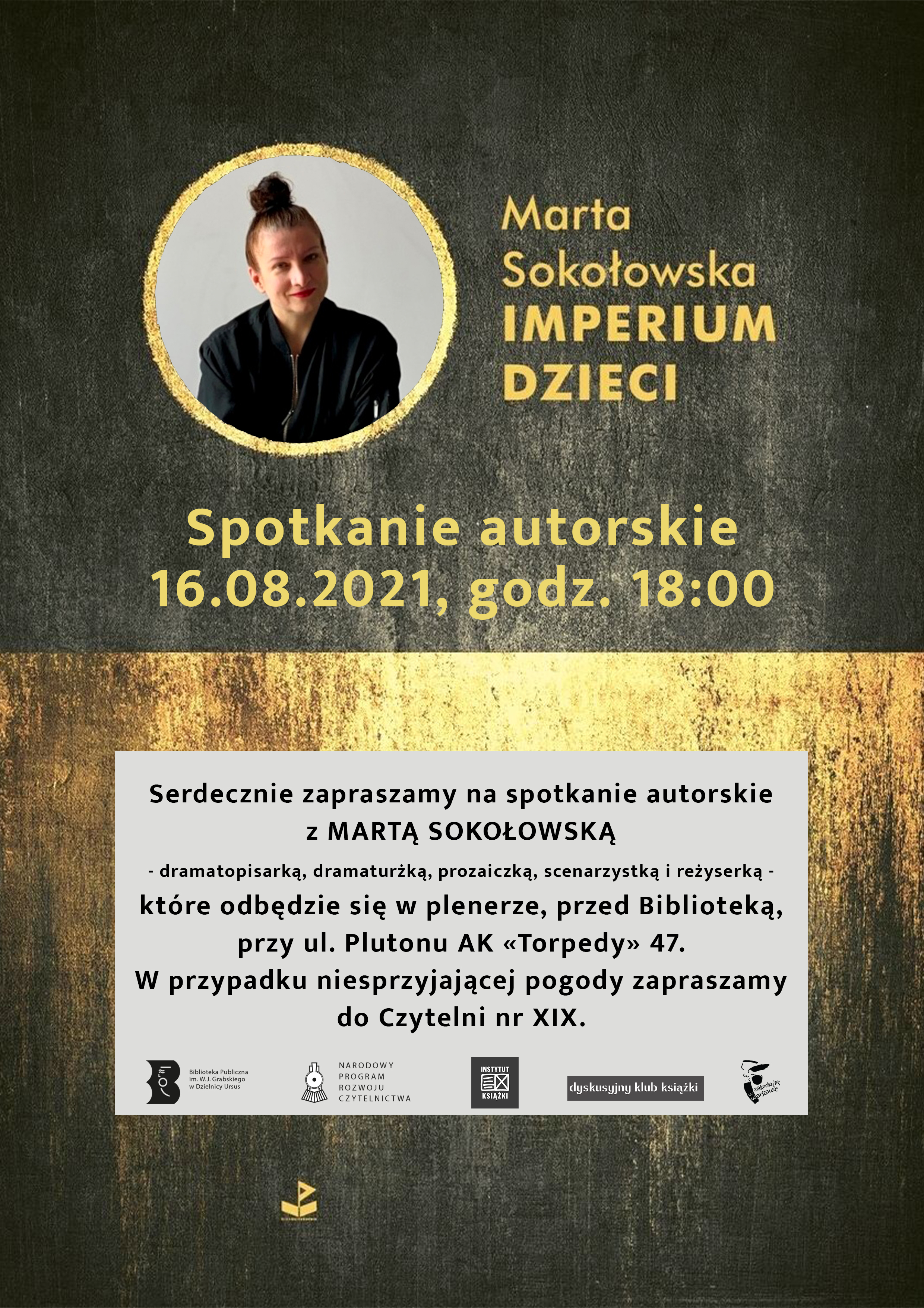 Serdecznie zapraszamy na spotkanie autorskie z Martą Sokołowską, które odbędzie się 16.08 o godz. 18:00 w plenerze, przed Biblioteką, przy ul. Plutonu AK “Torpedy” 47. W przypadku niesprzyjającej pogody zapraszamy do Czytelni nr XIX.