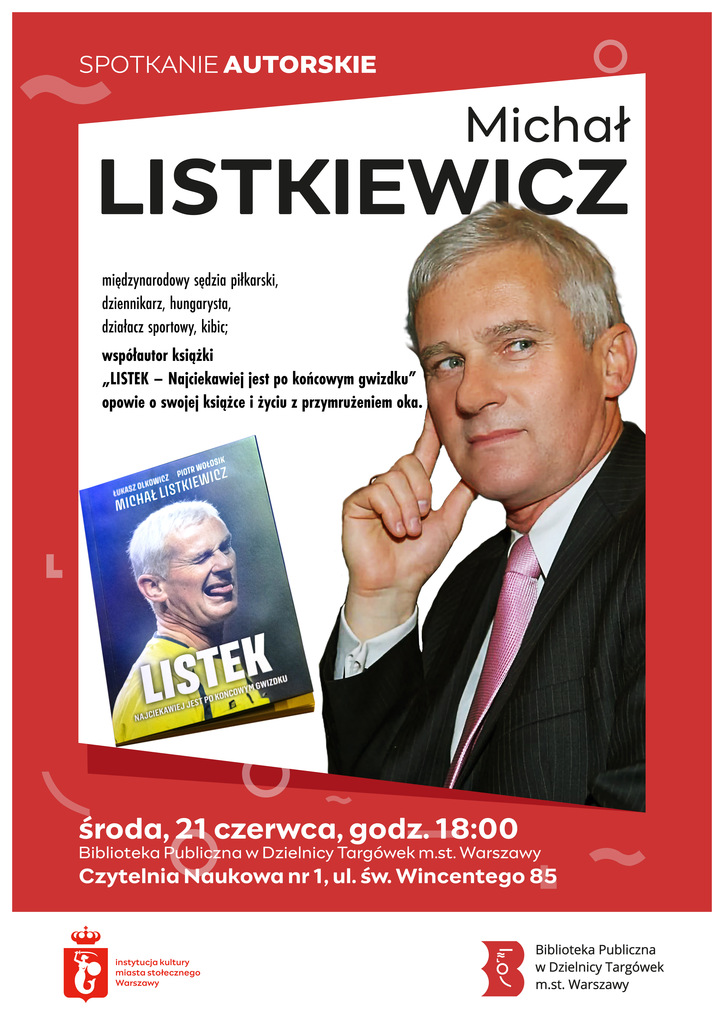 Zapraszamy do Biblioteki Publicznej na Targówku na spotkanie autorskie z Michałem Listkiewiczem – współautorem książki „Listek – Najciekawiej jest po końcowym gwizdku”.
