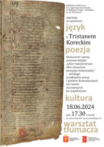 Wypożyczalnia dla Dorosłych i Młodzieży nr 44, mieszcząca się przy ul. Jana Nowaka-Jeziorańskiego 24, zaprasza we wtorek, 18 czerwca o godz. 17:30, na spotkanie z Tristanem Koreckim, tłumaczem i poetą, autorem książki „Liber translatorium albo sumariusz poezyjno-historyjalny”. Udział w spotkaniu jest wolny.