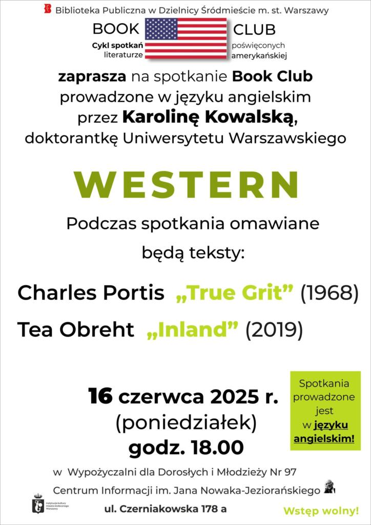 Podczas spotkania omawiane będą: „True Grit” – Charles Portis (1968), „Inland” – Tea Obreht (2019).