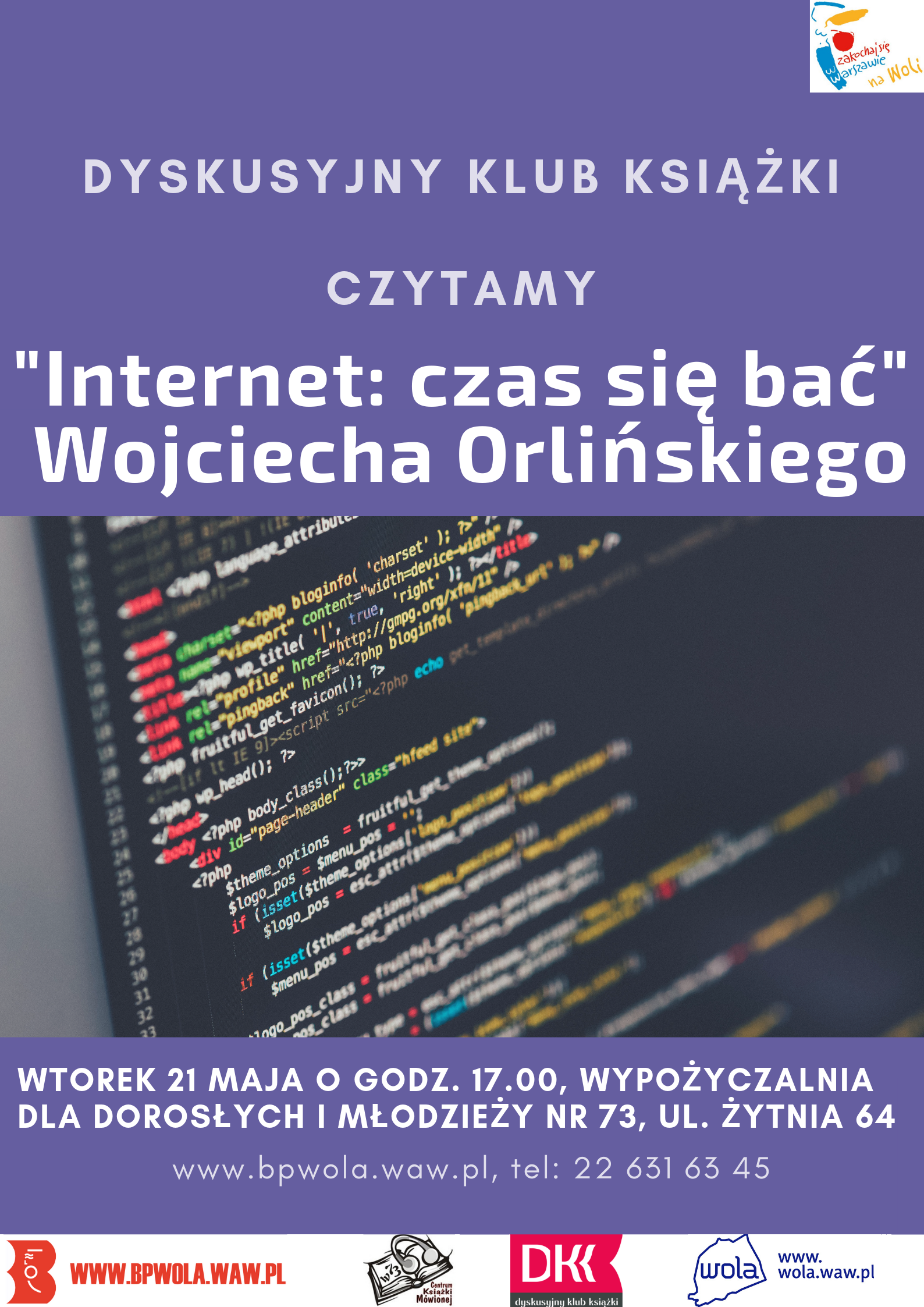Wypożyczalnia dla Dorosłych i Młodzieży nr 73 zaprasza na spotkanie Dyskusyjnego Klubu Książki, poświęcone tym razem książce „Internet. Czas się bać” Wojciecha Orlińskiego.