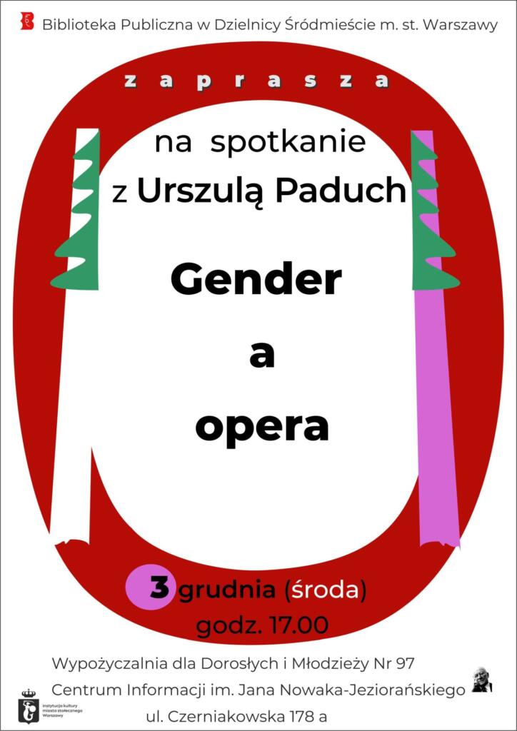 Biblioteka Publiczna w Dzielnicy Śródmieście m.st. Warszawy zaprasza na spotkanie z Urszulą Paduch pt. „Gender a opera”.