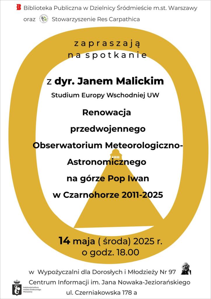 Biblioteka Publiczna w Dzielnicy Śródmieście m.st. Warszawy oraz Stowarzyszenie Res Carpathica zapraszają na spotkanie z dyr. Janem Malickim (Studium Europy Wschodniej UW). Tematem spotkania będzie „Renowacja przedwojennego Obserwatorium Meteorologiczno- Astronomicznego na górze Pop Iwan w Czarnohorze 2011-2025”.