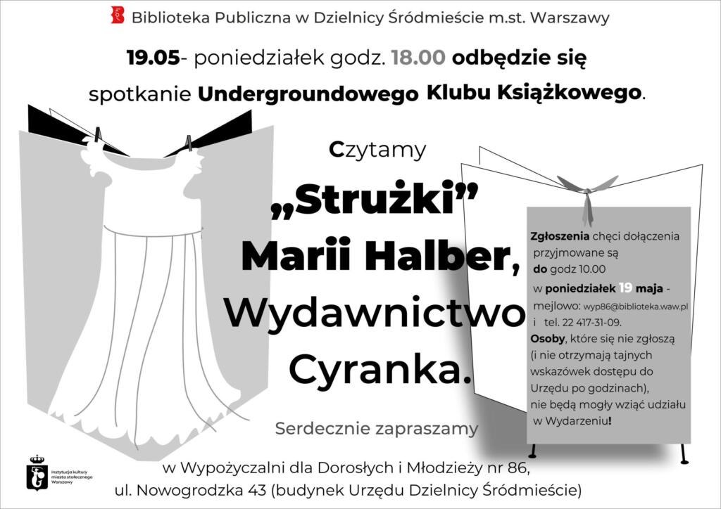 19 maja o godzinie 18:00 na spotkanie Undergroundowego Klubu Książkowego. Porozmawiamy o książce „Strużki” Marii Halber.