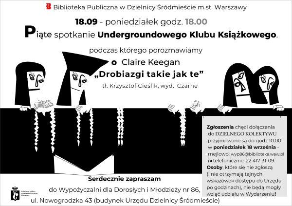 Wypożyczalnia dla Dorosłych i Młodzieży nr 86, ul. Nowogrodzka 43 (budynek Urzędu Dzielnicy Śródmieście) zaprasza w poniedziałek 18 września o godzinie 18:00 na piąte spotkanie Undergroundowego Klubu Książkowego.