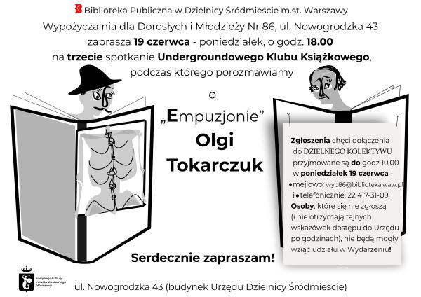 do Wypożyczalni dla Dorosłych i Młodzieży Nr 86, ul. Nowogrodzka 43 (budynek Urzędu Dzielnicy Śródmieście) na trzecie spotkanie Undergroundowego Klubu Książkowego.