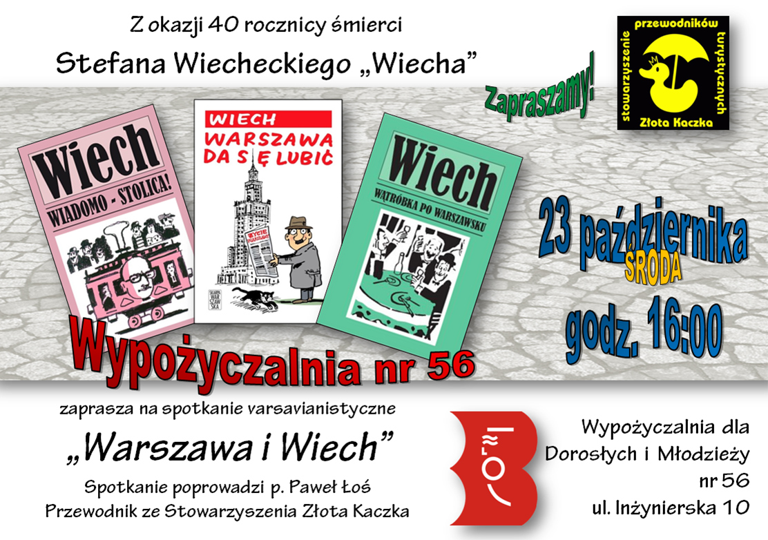 Wypożyczalnia dla Dorosłych i Młodzieży nr 56 ul. Inżynierska 10,  zaprasza na spotkanie varsavianistyczne „Warszawa i Wiech” z okazji 40. rocznicy śmierci Stefana Wiecheckiego „Wiecha”.