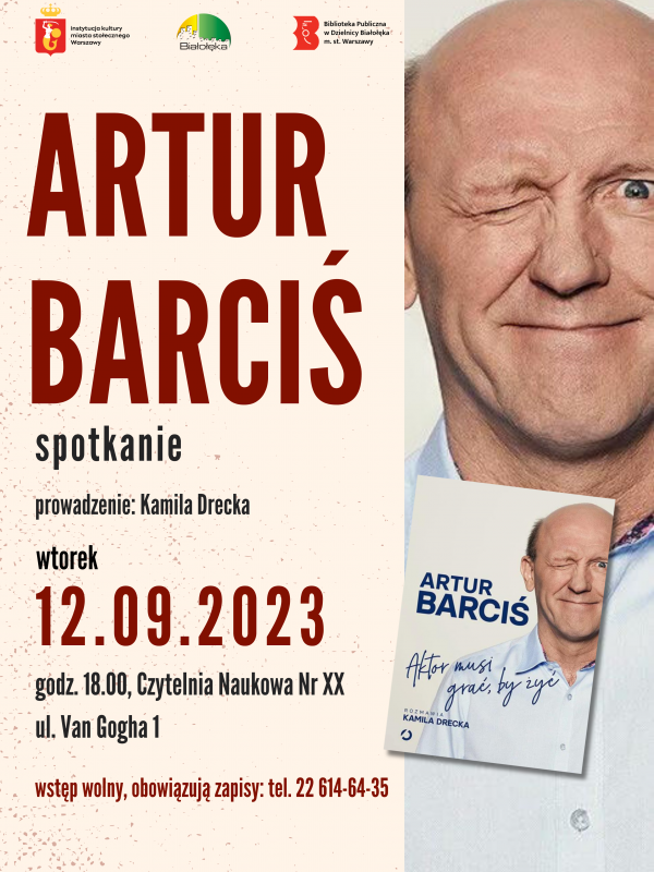 Artur Barciś jest aktorem filmowym, teatralnym, telewizyjnym i dubbingowym, reżyserem i scenarzystą. Na scenie występuje od 1979 roku, stworzył wiele niezapomnianych ról, grał u Kieślowskiego, Hoffmana, Wajdy i Kutza. Spotkanie odbędzie się wokół książki „Aktor musi grać, by żyć”, a rozmowę poprowadzi Kamila Drecka, współautorka książki.