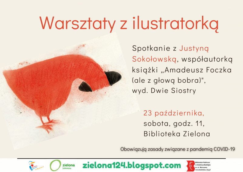W sobotę 23 października odbędą się w Zielonej warsztaty z ilustratorką Justyną Sokołowską. Książka, której jest współautorką — „Amadeusz Foczka (ale z głową bobra)”, Wydawnictwo Dwie Siostry — zdobyła nagrodę główną w konkursie Jasnowidze III (pokonkursowe prace można oglądać w naszej bibliotece).