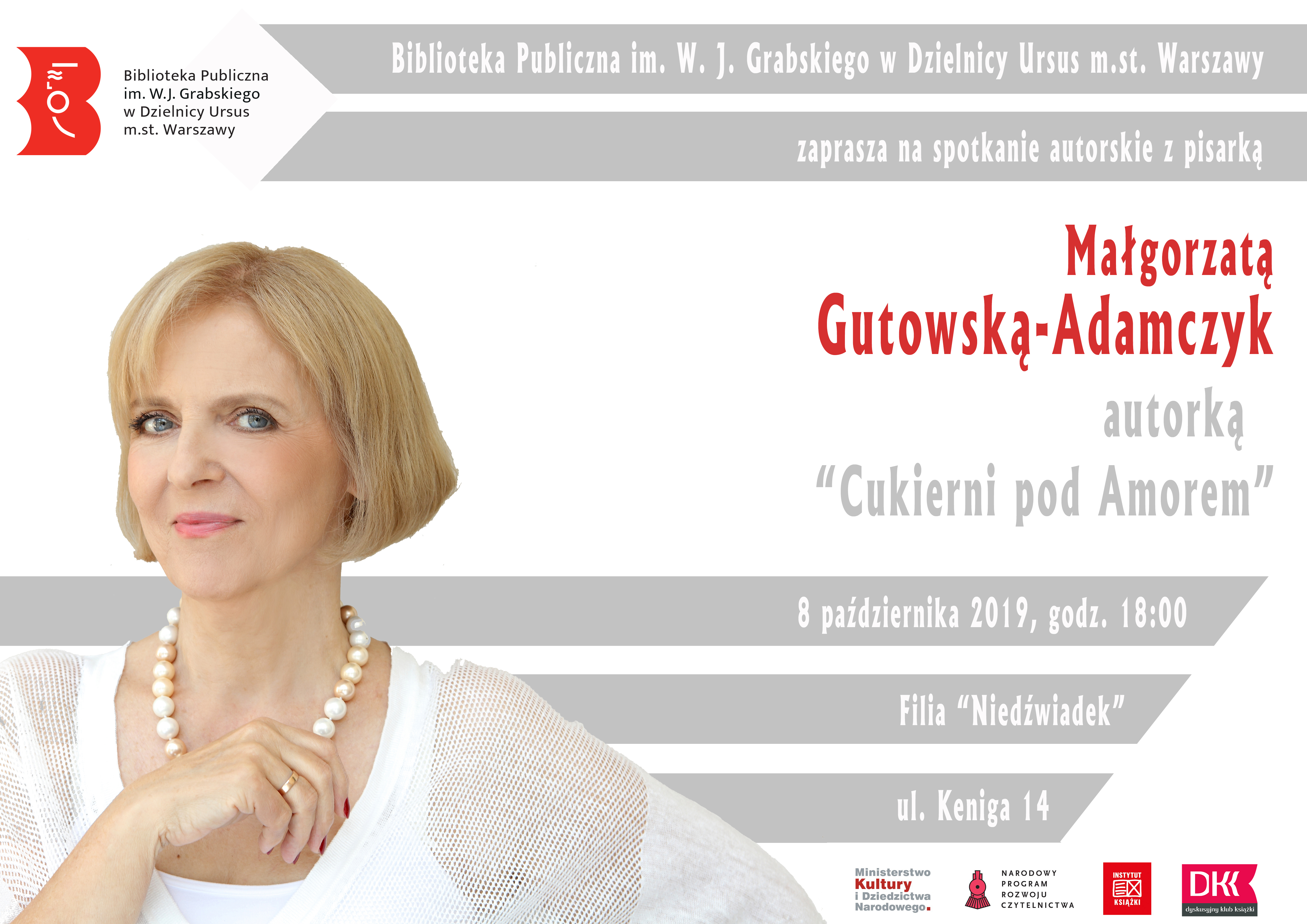 Biblioteka Publiczna, Dyskusyjny Klub Książki oraz Instytut Książki serdecznie zapraszają na spotkanie autorskie z Małgorzatą Gutowską-Adamczyk.