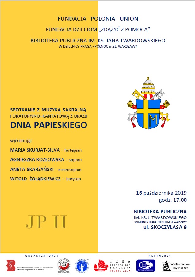 Biblioteka Publiczna im. Księdza Jana Twardowskiego w Dzielnicy Praga-Północ m.st. Warszawy, zaprasza na spotkanie z muzyką sakralną i oratoryjno-kantatową z okazji Dnia Papieskiego.