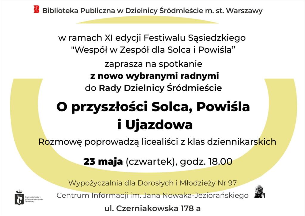 Wypożyczalnia dla Dorosłych i Młodzieży Nr 97 Centrum Informacji im. Jana Nowaka-Jeziorańskiego (ul. Czerniakowska 178 a) zaprasza na spotkanie z nowo wybranymi radnymi do Rady Dzielnicy Śródmieście z okręgu wyborczego nr 1 obejmującego swoim zasięgiem Solec, Powiśle
