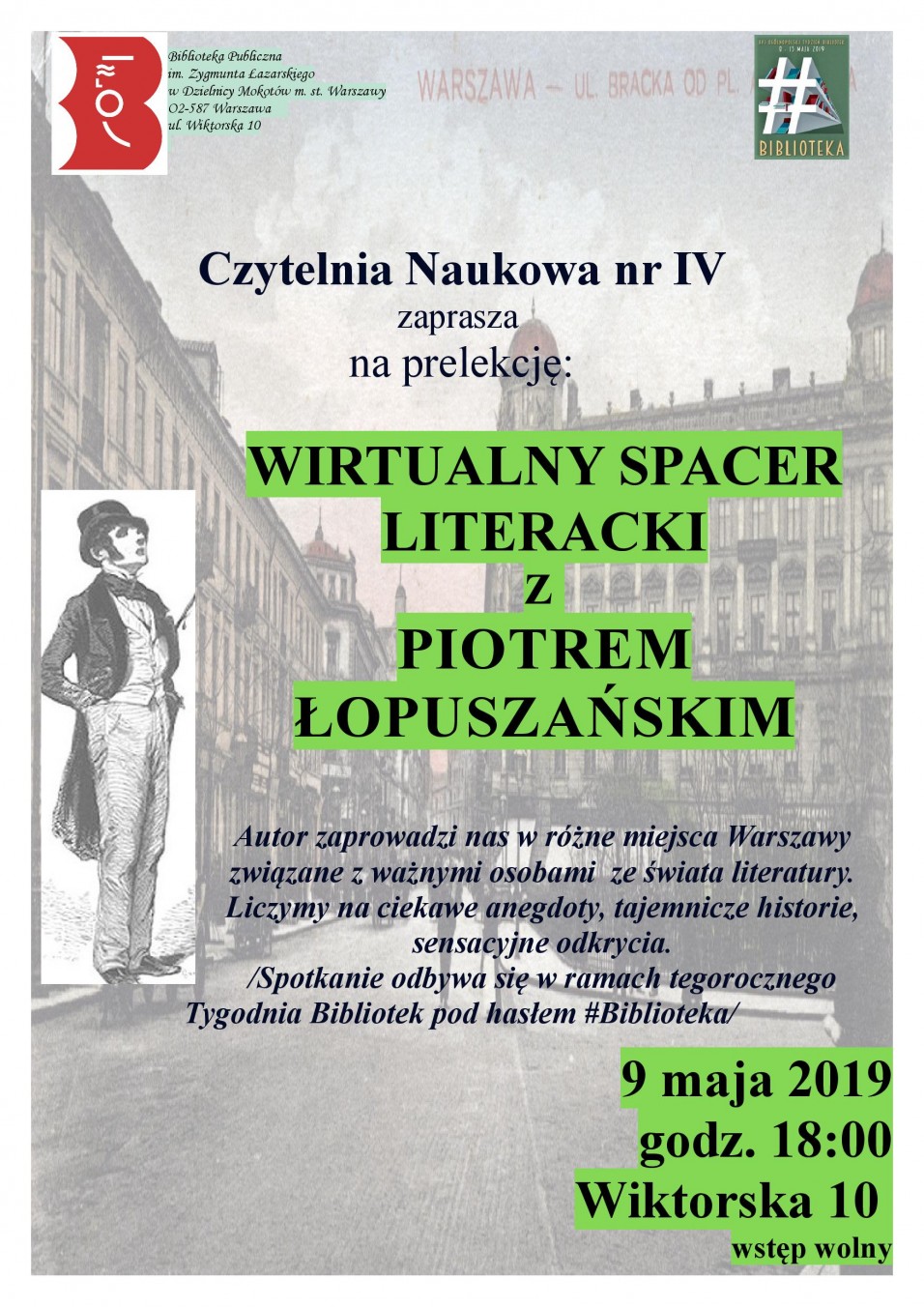 W ramach programu „Tygodnia Bibliotek” – pt.: #biblioteka – zapraszamy na spotkanie z Piotrem Łopuszańskim – pisarzem, dziennikarzem, filozofem oraz autorem książek. Tym razem Piotr Łopuszański zabierze nas na wirtualny spacer i zaprezentuje miejsca związane z literacką historią Warszawy. Na pewno nie zabraknie ciekawych opowieści, pełnych anegdot i nie odkrytych tajemnic.