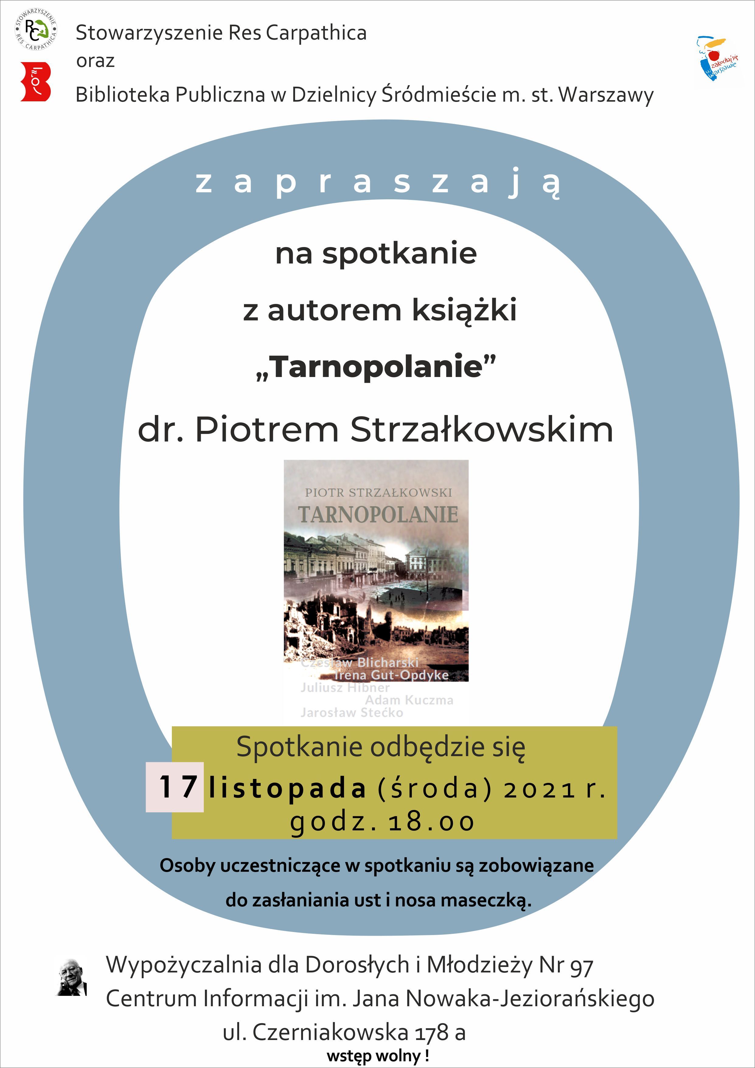 Stowarzyszenie Res Carpathica oraz Biblioteka Publiczna w Dzielnicy Śródmieście m.st. Warszawy zaprasza do Wypożyczalni dla Dorosłych i Młodzieży nr 97 i Centrum Informacji im. Jana Nowaka-Jeziorańskiego przy ul. Czerniakowskiej 178a na spotkanie z autorem książki „Tarnopolanie”, dr Piotrem Strzałkowskim.