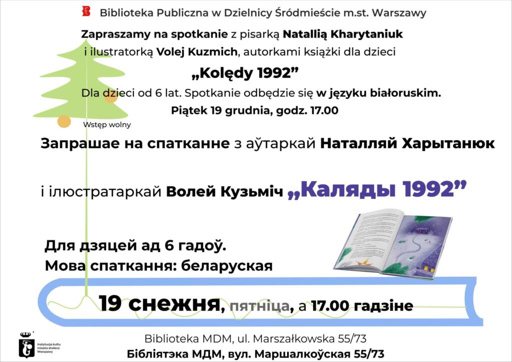 Zapraszamy na spotkanie w języku białoruskim z pisarką Natallią Kharytaniuk i ilustratorką Volej Kuzmich, autorkami książki dla dzieci „Kolędy 1992”. Spotkanie dla dzieci od 6 lat odbędzie się 19 grudnia o godzinie 17:00 w Bibliotece MDM (ul. Marszałkowska 55/73).