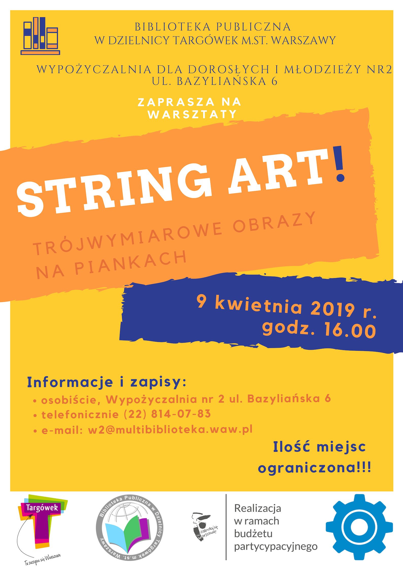 String Art, obrazy z nici, twórcza technika wyplatania obrazów z kolorowych nici na papierze, ramkach lub deskach. Dzięki tej technice można w prosty sposób wykonać unikalne ozdoby do domu, biura lub po prostu zrobić komuś oryginalny prezent. Podczas warsztatów pod okiem instruktora będą robione trójwymiarowe obrazy na piankach.