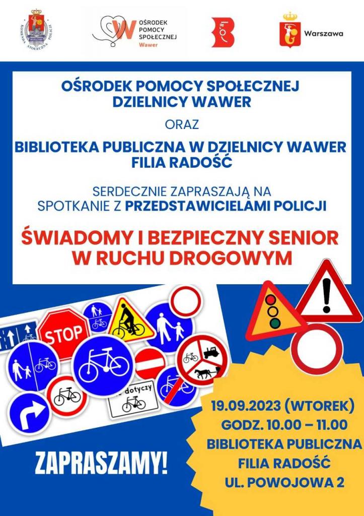 19 września o godzinie 10.00 w Bibliotece w Radości przy ul. Powojowej 2 odbędzie się spotkanie z przedstawicielami wawerskiej Policji, na które serdecznie zapraszamy Seniorów. Tematem rozmowy będzie ŚWIADOMY I BEZPIECZNY SENIOR W RUCHU DROGOWYM.