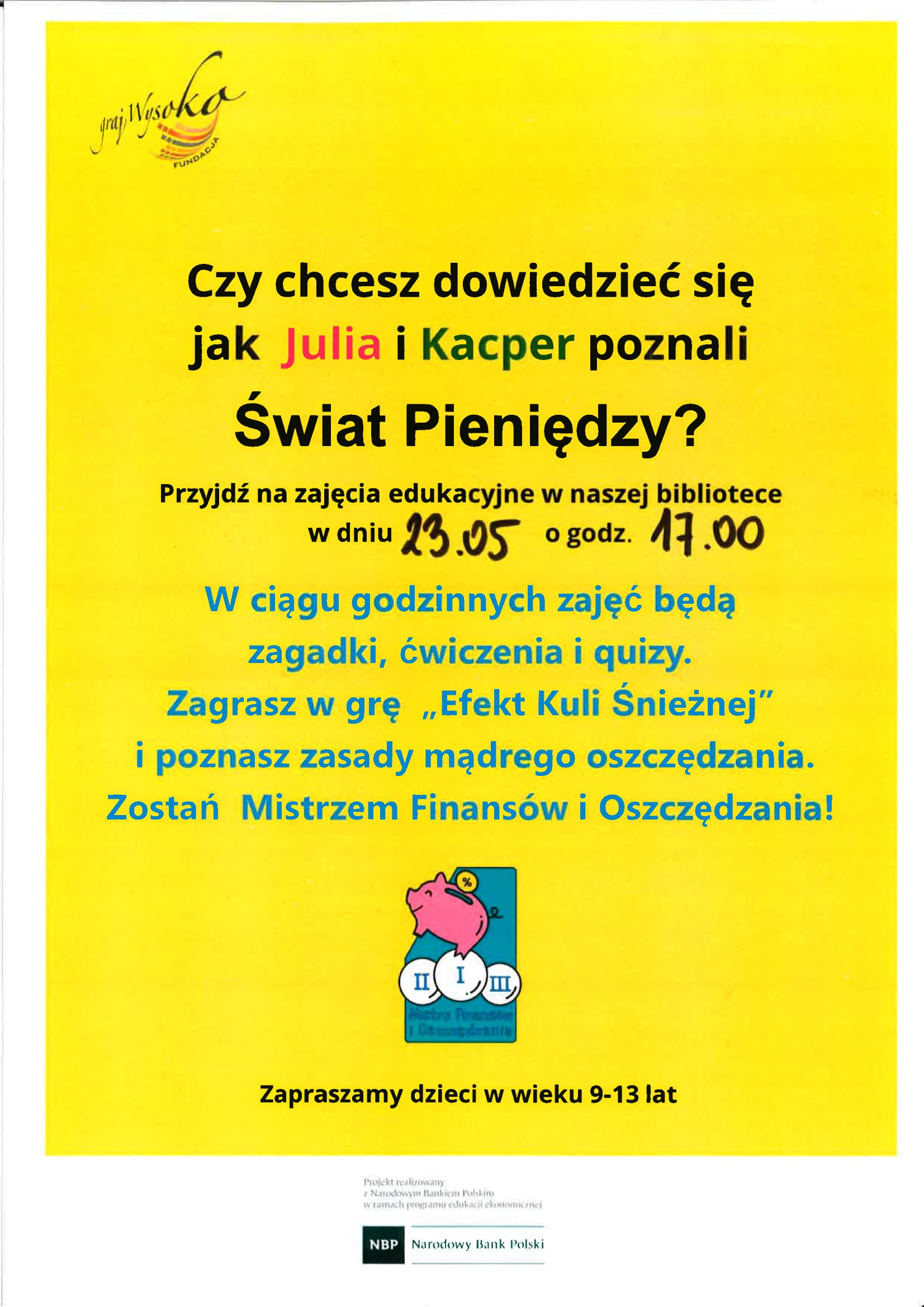 Zapraszamy w czwartek 23 maja o godzinie 17:00, do Biblioteki dla Dzieci i Młodzieży nr 44 przy ulicy Górnośląskiej 1, na zajęcia edukacyjne dla dzieci w wieku 9-13 lat. Będą zagadki, gry, ćwiczenia, quizy. Projekt realizowany jest przez fundację Graj Wysoko wspólnie z Narodowym Bankiem Polskim, w ramach programu edukacji ekonomicznej.