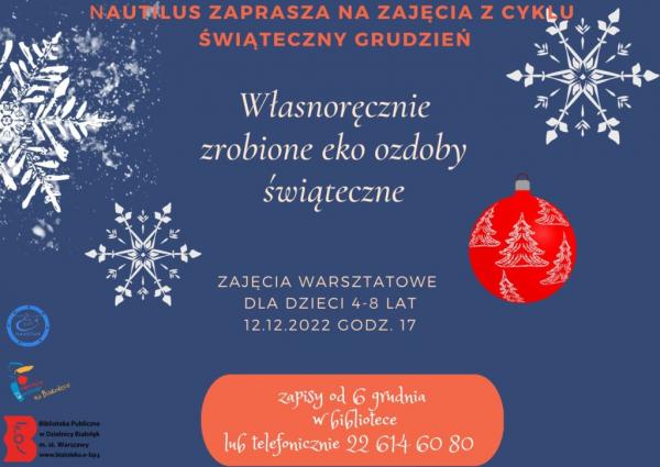 Razem z dziećmi postaramy się wykorzystać naturalne materiały i sprawdzimy jak zainspirują nas do ozdobienia świątecznego drzewka w Nautilusie. Będziemy malować, wycinać kleić i kolorować a w tle będą się sączyć najpiękniejsze polskie kolędy…