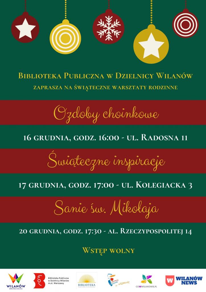 Z myślą o wspólnym spędzeniu czasu oraz upiększeniu naszych choinek i domów własnoręcznie zrobionymi ozdobami zapraszamy Państwa na świąteczne warsztaty rodzinne.