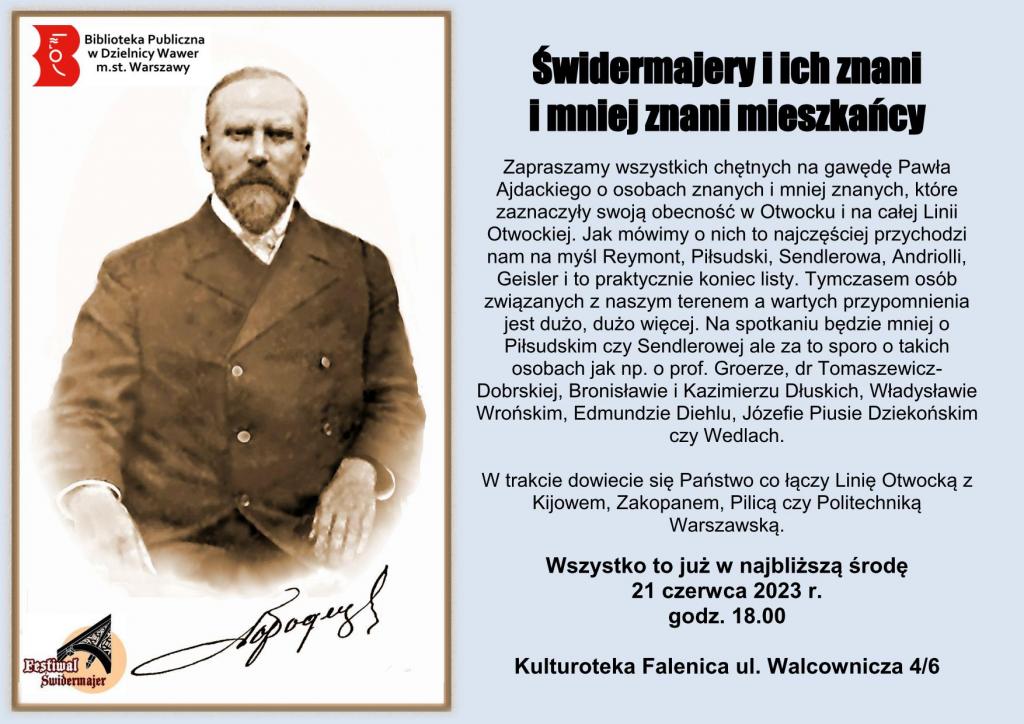 Serdecznie zapraszamy 21 czerwca (środa) na godz. 18.00 do Kulturoteki w Falenicy na Festiwal Świdermajer, który poprowadzi Paweł Ajdacki. Szczegóły na plakacie.