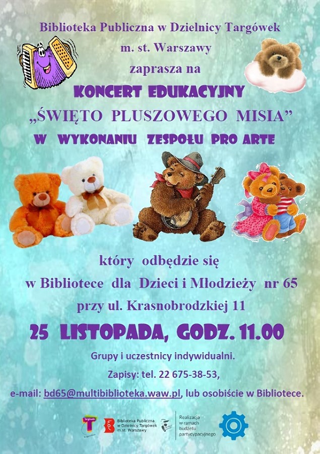 Biblioteka Publiczna w Dzielnicy Targówek m.st. Warszawy zaprasza na koncert z okazji „Święta Pluszowego Misia”.