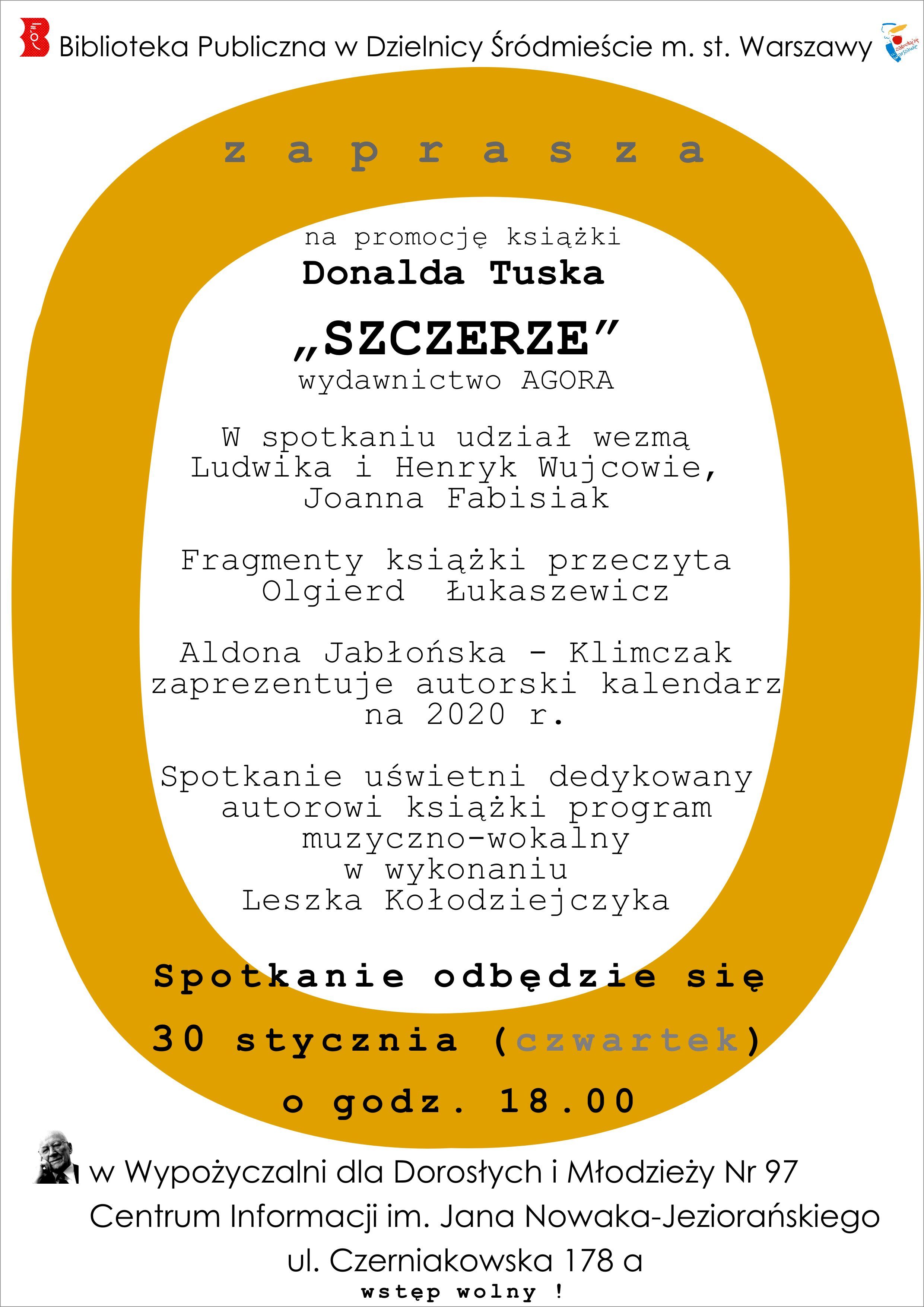 Biblioteka Publiczna w Dzielnicy Śródmieście m.st. Warszawy zaprasza w czwartek 30 stycznia o godzinie 18:00 do Wypożyczalni dla Dorosłych i Młodzieży nr 97 przy ulicy Czerniakowskiej 178A na spotkanie i promocję książki Donalda Tuska pt.: „Szczerze”. W spotkaniu udział wezmą Ludwika i Henryk Wujcowie, Joanna Fabisiak. Fragmenty książki przeczyta Olgierd Łukaszewicz. Aldona Jabłońska-Klimczak zaprezentuje autorski kalendarz na 2020 r. Spotkanie uświetni, dedykowany autorowi książki, program muzyczno-wokalny w wykonaniu Leszka Kołodziejczyka.