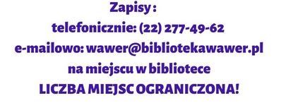 Wawerska Biblioteka Publiczna oraz Ośrodek Psychoterapii i Diagnozy Psychologicznej „Punkt Relacji”, zapraszają rodziców dzieci w wieku przedszkolnym i wczesnoszkolnym oraz pedagogów na spotkanie z psychologiem.