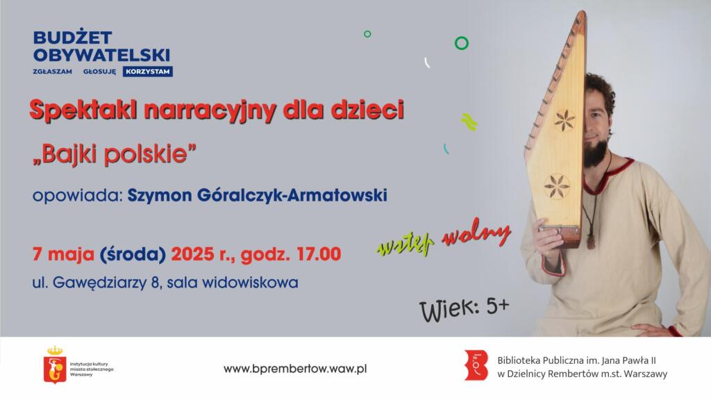 Wyrusz w magiczną podróż po baśniach pełnych tajemnic i humoru. Spektakl narracyjny dla dzieci „Bajki polskie” w wykonaniu Szymona Góralczyka Armatowskiego odbędzie się w bibliotece przy ul. Gawędziarzy 8, 7 maja o godz. 17:00.