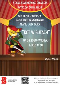 Z okazji Światowego Dnia Kota – Wypożyczalnia nr 28 wraz z Teatrem Lalek Bajka, zaprasza dzieci w wieku przedszkolnym na spektakl zatytułowany „Kot w butach”, który odbędzie się 4 lutego o godzinie 17:30 w Wypożyczalni nr 28 przy ul. 1 Sierpnia 36a.