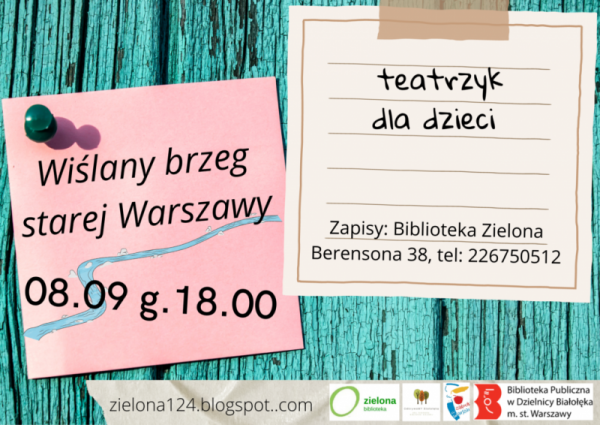 Uwaga! Mamy niespodziankę dla dzieci! Ciepły, wrześniowy wieczór i wygodne miejsce to idealna okazja do poznania niezwykłej opowieści a to oznacza tylko jedno. Do Zielonej przyjeżdża teatrzyk! Zapraszamy dzieci 8-go września o godz.18.00 na przedstawienie pt.: „Wiślany brzeg starej Warszawy” Zapowiada się wspaniały teatralny wieczór.