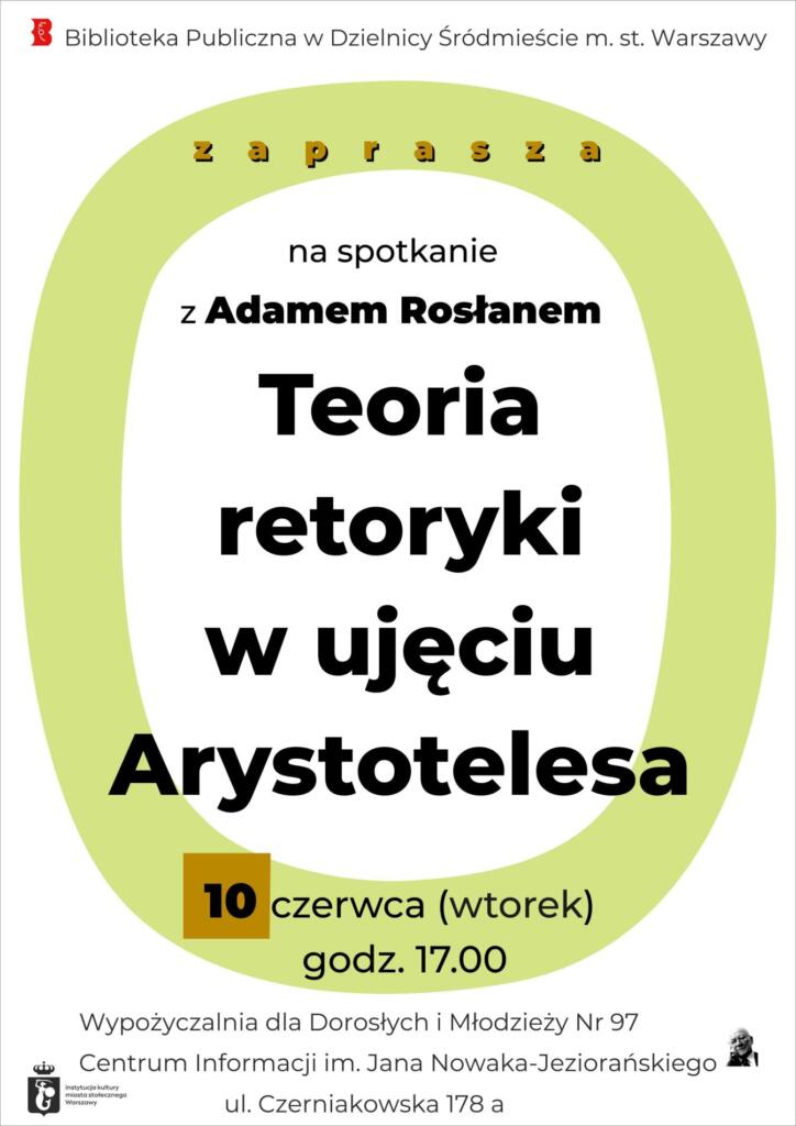 Biblioteka Publiczna w Dzielnicy Śródmieście m.st. Warszawy zaprasza na wykład Adama Rosłana pt. „Teoria retoryki w ujęciu Arystotelesa”.