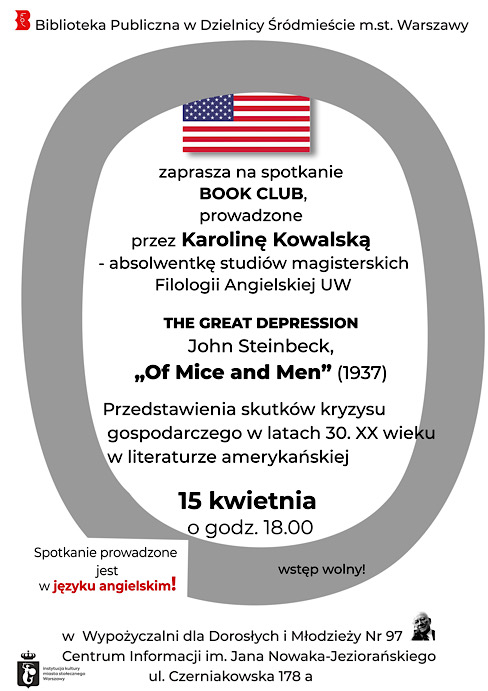 Na spotkaniu „The Great Depression” 15 kwietnia o godzinie 18:00 omówimy powieść „Of Mice and Men” – autor John Steinbeck i przedstawimy skutki kryzysu gospodarczego w latach 30. XX wieku w literaturze amerykańskiej.