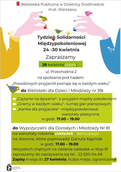 Zapraszamy 28 kwietnia w godzinach 17:00-19:00 do Biblioteki nr 39 i Wypożyczalni nr 81 przy ulicy Przechodniej 2 na spotkanie