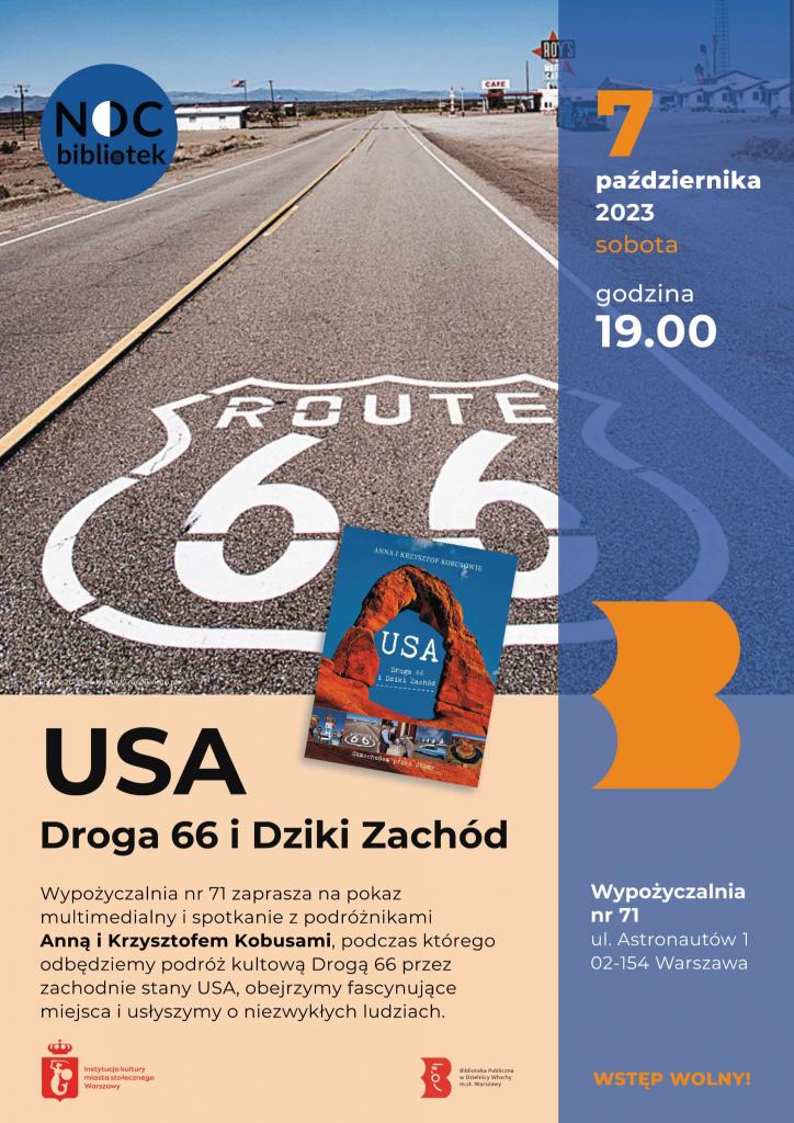 W sobotę 7 października 2023 od godz. 19.00 zapraszamy do świętowania IX ogólnopolskiej Nocy Bibliotek w Wypożyczalni nr 71 podczas spotkania z podróżnikami Anną i Krzysztofem Kobusami i pokazu multimedialnego pt. USA. Droga 66 i Dziki Zachód.