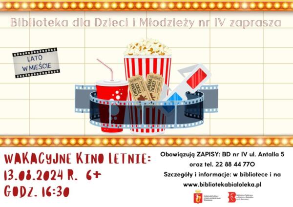 Biblioteka dla Dzieci i Młodzieży nr IV zaprasza 13.08.2024 r. o godz. 16:30 na seans filmowy w wakacyjne popołudnie. Film przeznaczony dla dzieci w wieku 6+, szczegóły w bibliotece.