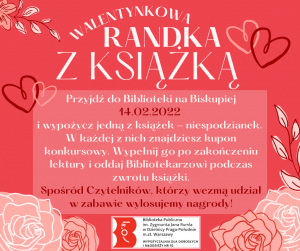 Każda osoba pełnoletnia, która odwiedzi Wypożyczalnię nr 92 w poniedziałek, 14 lutego, i wypożyczy książkę, otrzyma kupon uprawniający do udziału w zabawie. Regulamin akcji dostępny jest pod linkiem https://bppragapd.pl/pliki/plik/regulamin-walentynkowa-randkadocx-1644415930.pdf