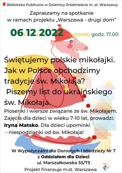 Będziemy świętować polskie mikołajki. Zajęcia dla dzieci w wieku 7-10 lat poprowadzi Iryna Matsko.